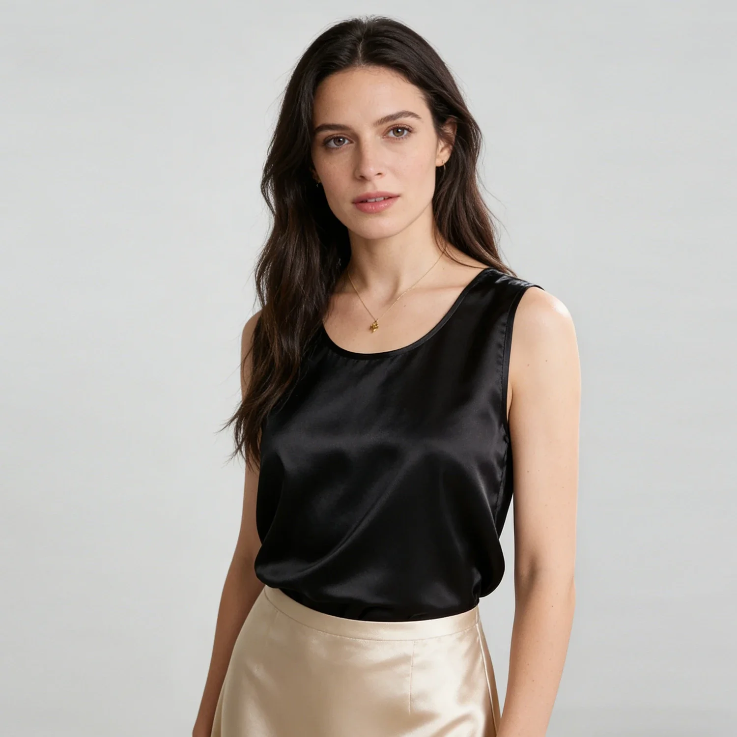 Designed to follow body contours with a flattering silhouette, this silk tank features a minimalist U-neckline and relaxed cuffs for effortless comfort. The clean-cut design offers versatile styling with distinctive details, making it adaptable for daytime to evening wear.